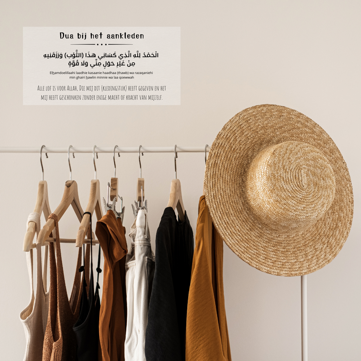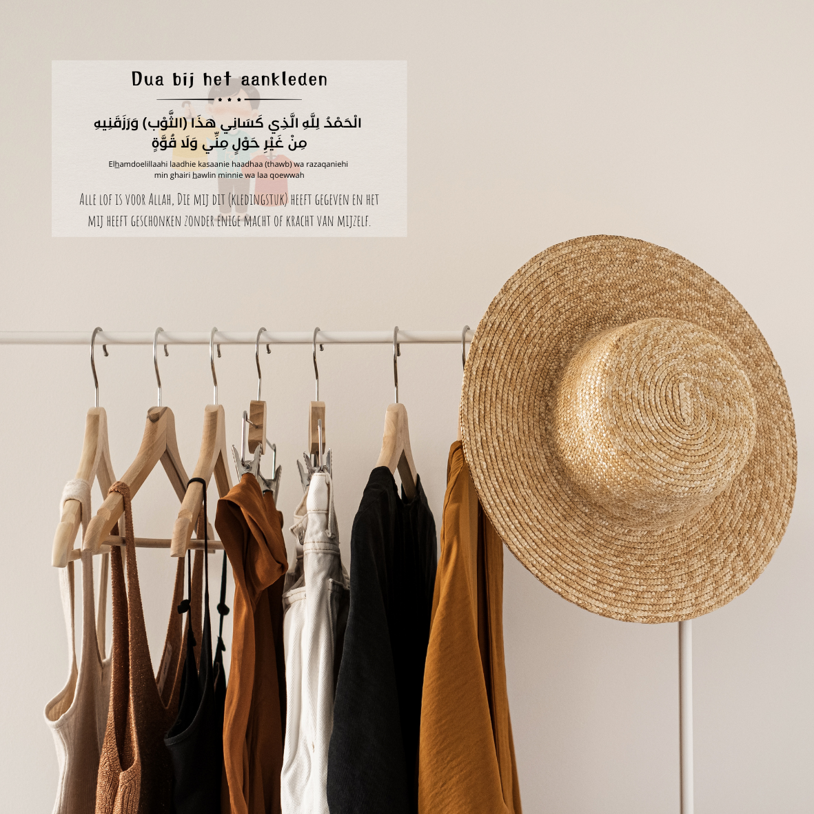 Binnen ons mooie geloof worden zelfs de kleinste dagelijkse handelingen omringd met betekenis. De Profeet ﷺ heeft ons geleerd om Allah te gedenken bij het aantrekken van kleding. Onze transparante dua sticker helpt je om deze mooie soennah dagelijks te herinneren en eenvoudig toe te passen.