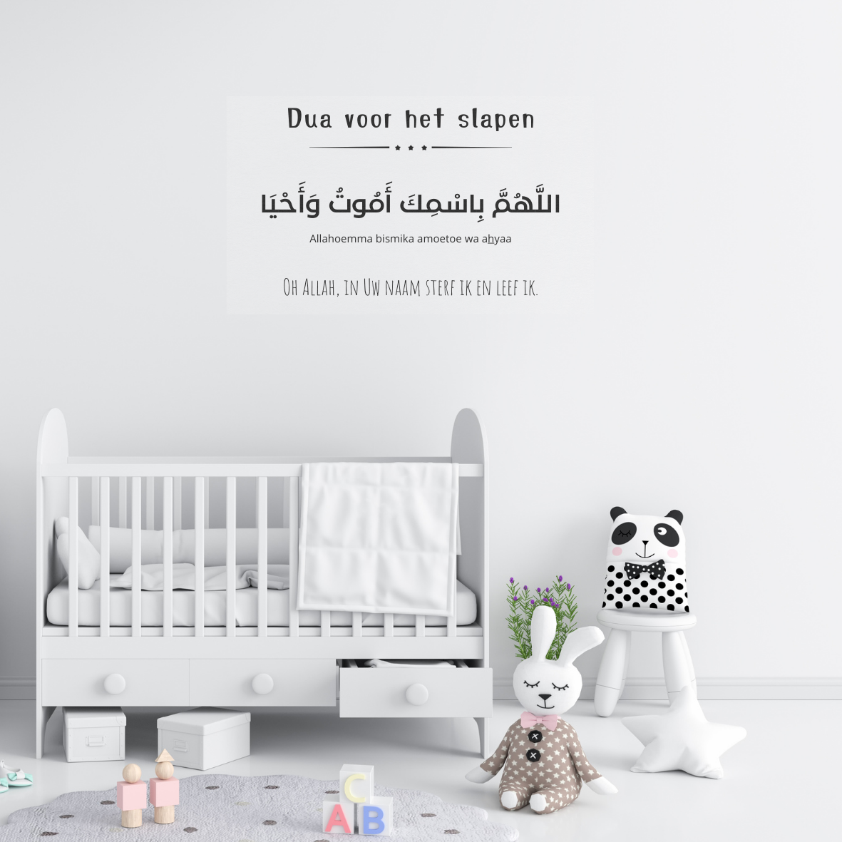 Het reciteren van deze dua voor het slapengaan brengt rust en veiligheid. Je vraagt Allah Zijn bescherming en zegeningen voordat je de nacht ingaat. Onze transparante dua sticker houdt deze belangrijke smeekbede altijd zichtbaar, zodat je er elke avond aan herinnerd wordt. Sluit je dag af met de woorden van Allah de meest Verhevene.
