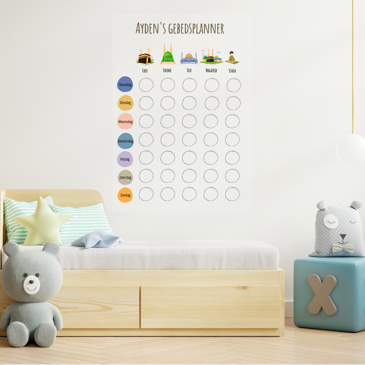 Onze gebedsplanner is ook geschikt om je kind te trainen om het gebed op tijd te verrichten. Vink de gebeden af met een whiteboardstift, zodat je de planner steeds opnieuw kunt gebruiken.