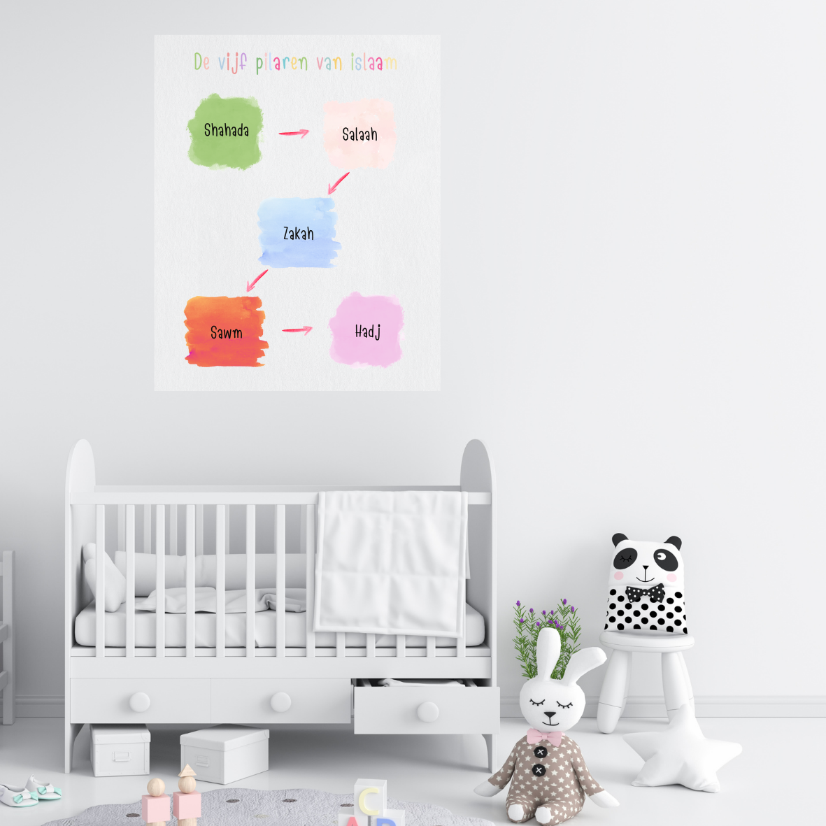 De vijf pilaren vormen het fundament van het islamitische geloof. Deze A4-sticker toont de vijf pilaren op een overzichtelijke en mooie manier. Een perfecte herinnering voor jong en oud om bewust te blijven van de kern van het geloof.