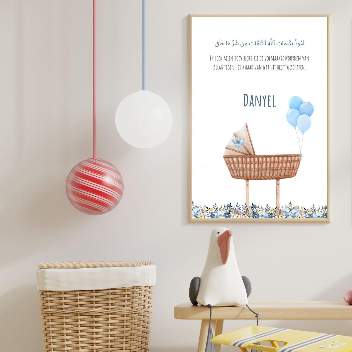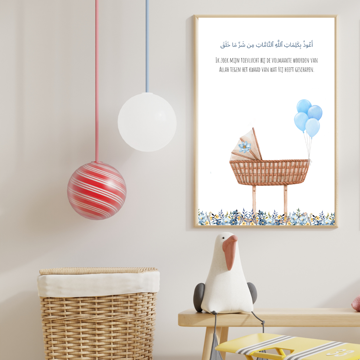 Deze lieve A4-sticker combineert een tedere illustratie met een krachtige dua in het Arabisch en Nederlands. Perfect om boven het wiegje of aan de muur van de kinderkamer te hangen.
