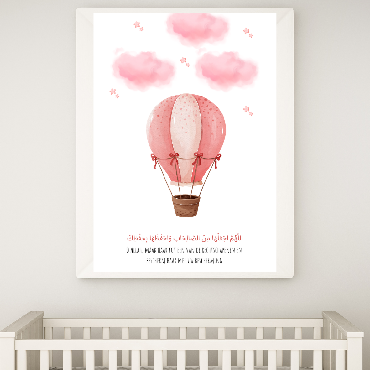 Deze lieve A4-sticker combineert een tedere illustratie met een krachtige dua in het Arabisch en Nederlands. Perfect om boven het wiegje of aan de muur van de kinderkamer te hangen.