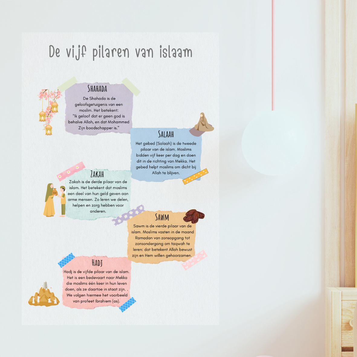 De vijf pilaren vormen de basis van het islamitische geloof. Voor kinderen, nieuwe moslims of wie zijn kennis wil opfrissen, biedt deze A4-sticker een duidelijke en toegankelijke uitleg van elk van de vijf pilaren.