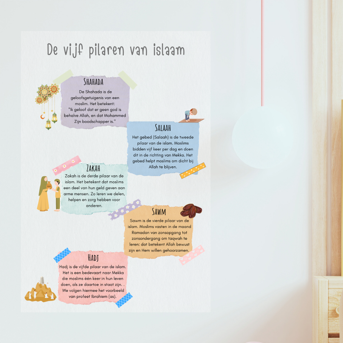De vijf pilaren vormen de basis van het islamitische geloof. Voor kinderen, nieuwe moslims of wie zijn kennis wil opfrissen, biedt deze A4-sticker een duidelijke en toegankelijke uitleg van elk van de vijf pilaren.