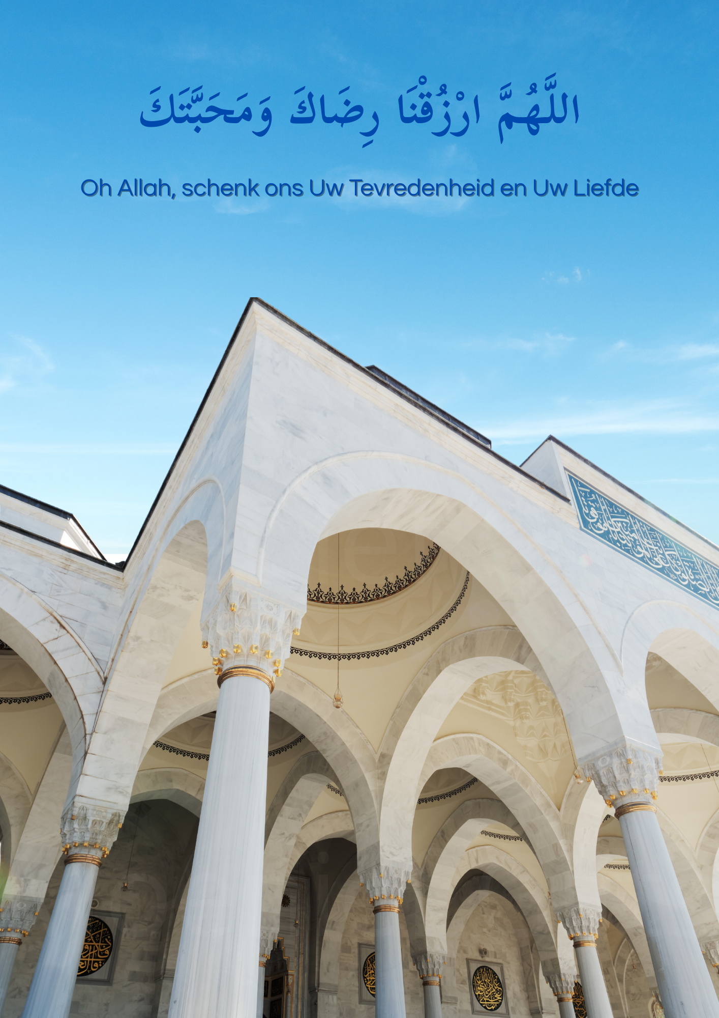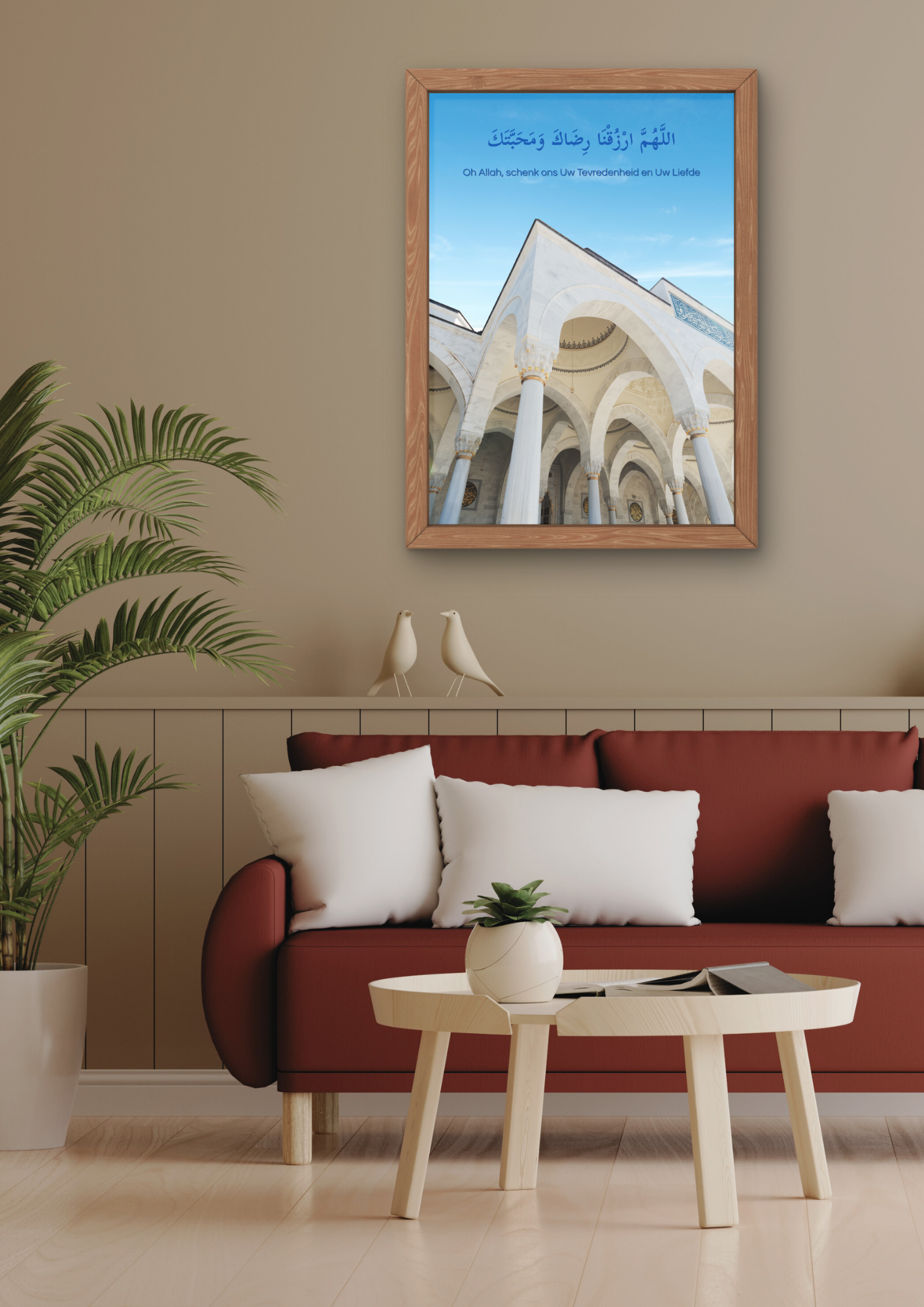 Een serene wandfoto met een prachtige moskee en een smeekbede om Allah’s tevredenheid en liefde. Een rustgevende toevoeging aan elke ruimte.
