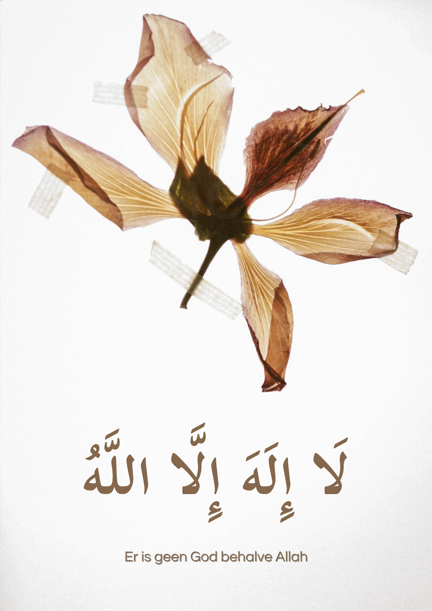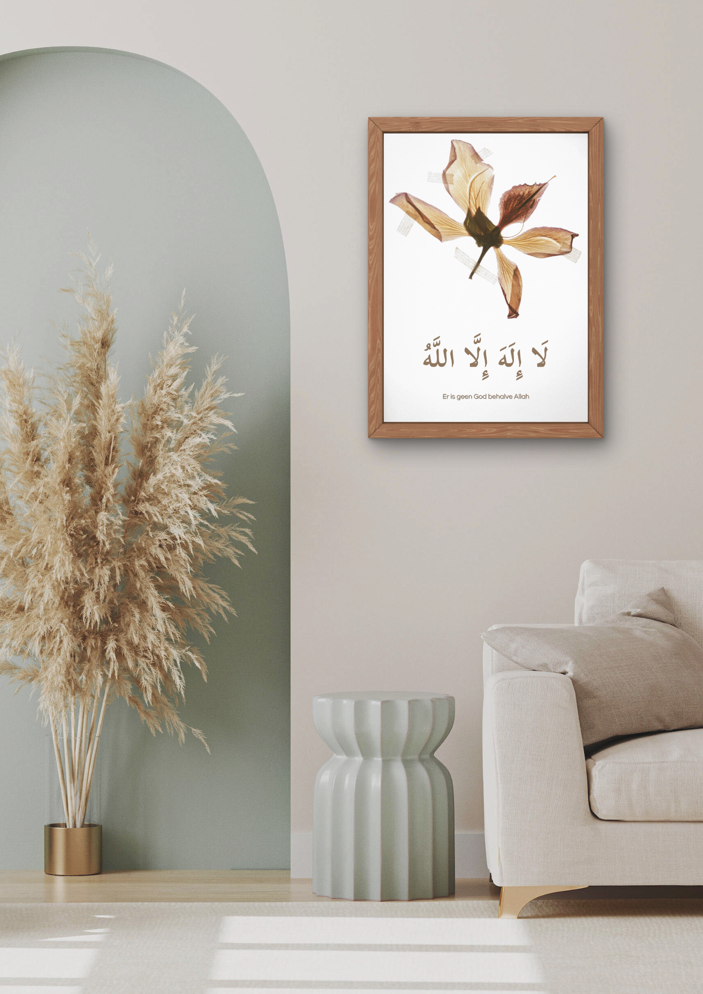 Een minimalistische en stijlvolle wandfoto met een gedroogde bloem en de tahliel: Laa ilaaha illaallah. Een rustige en elegante toevoeging aan elke ruimte.