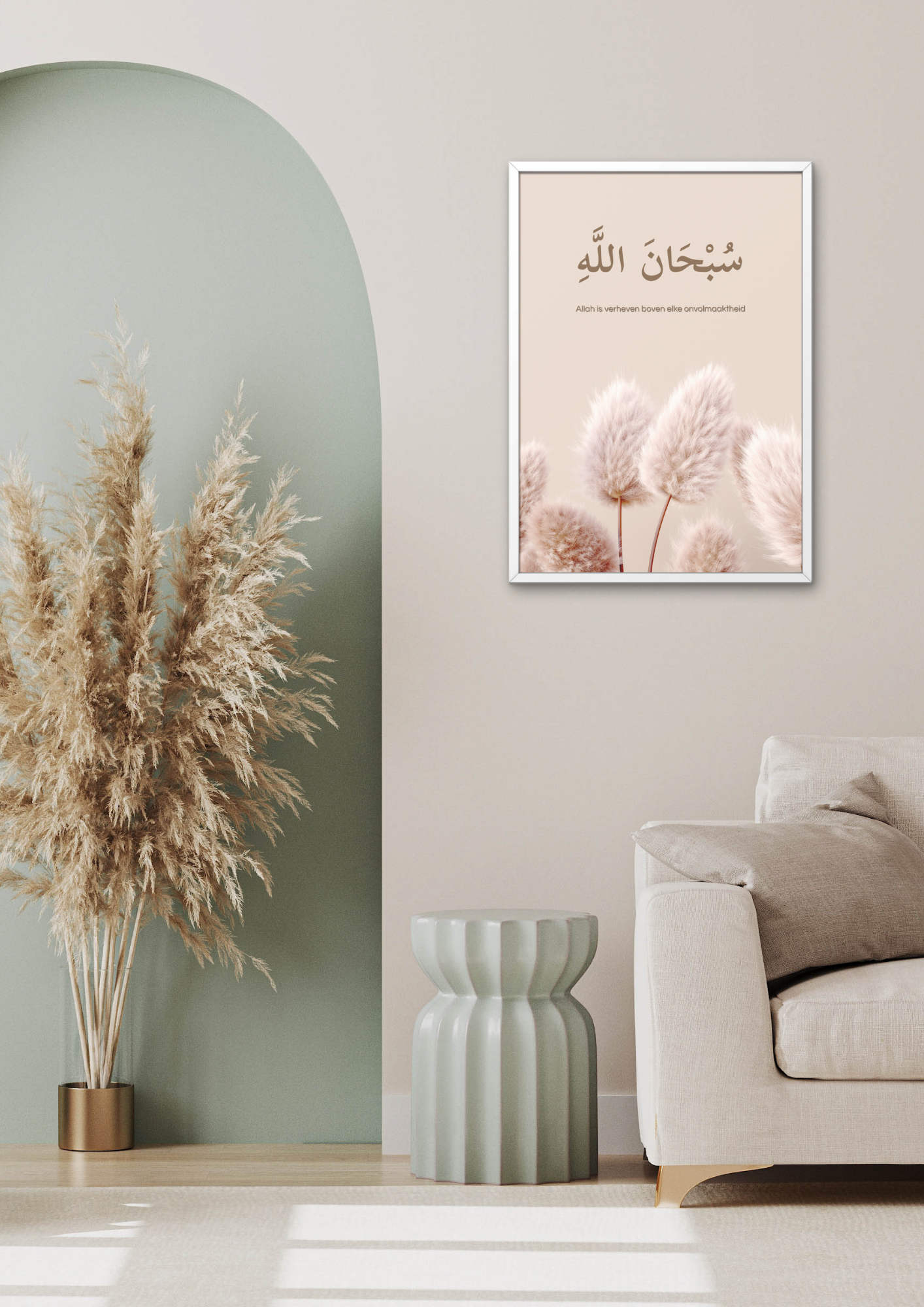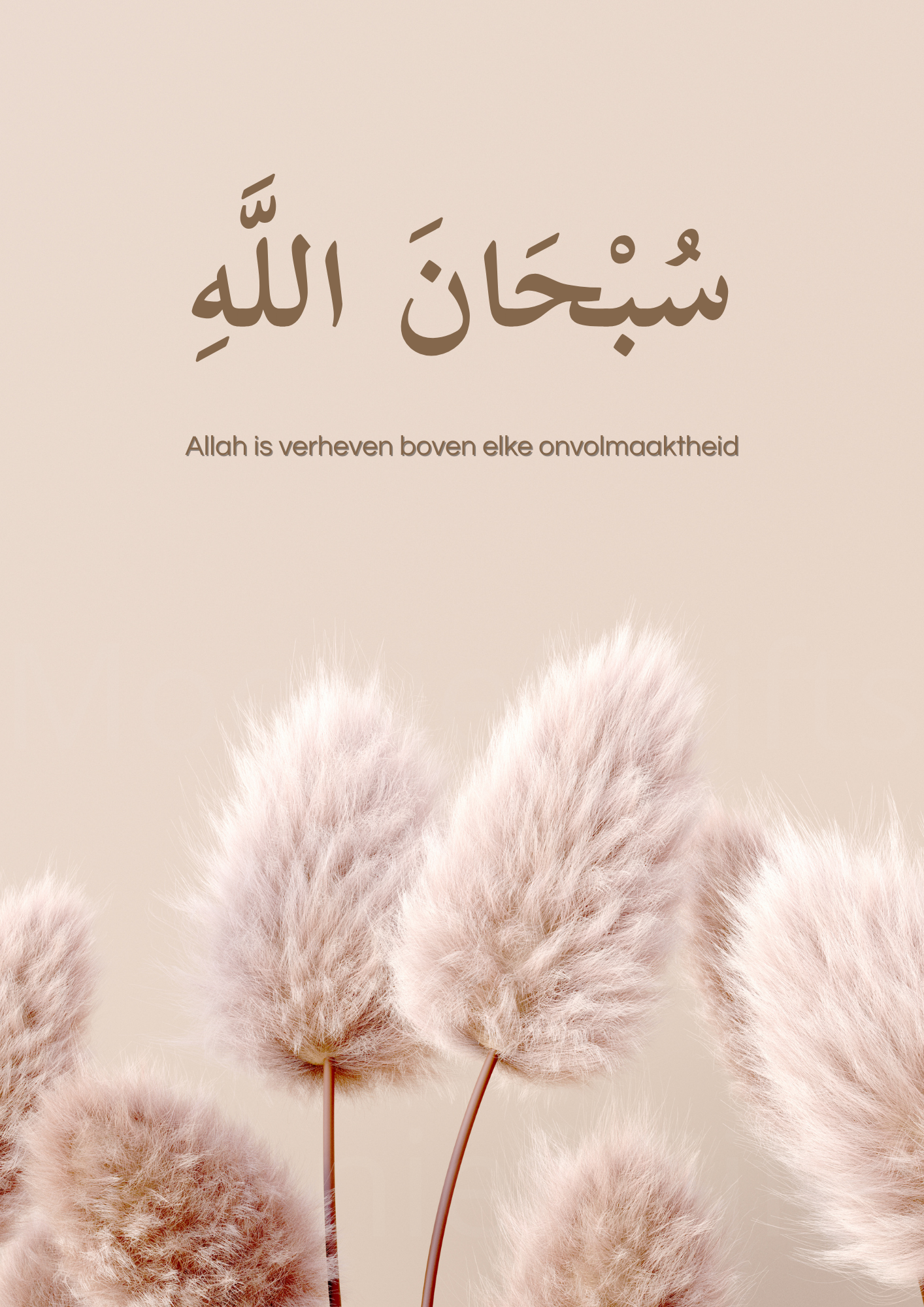 Een zachte en elegante wandfoto met pluizige pastelaccenten en de tekst “SubhānAllāh, Allah is verheven boven elke onvolmaaktheid.” Een subtiele herinnering aan Zijn perfectie en schoonheid.