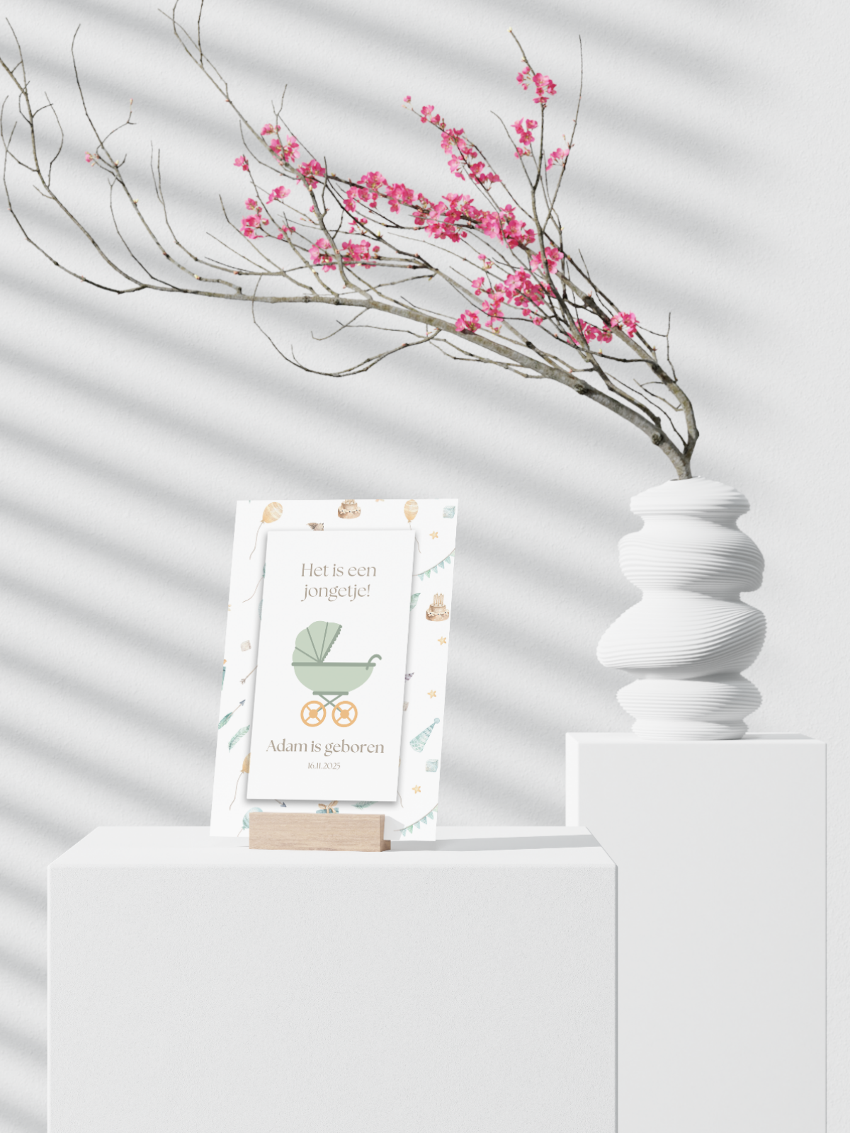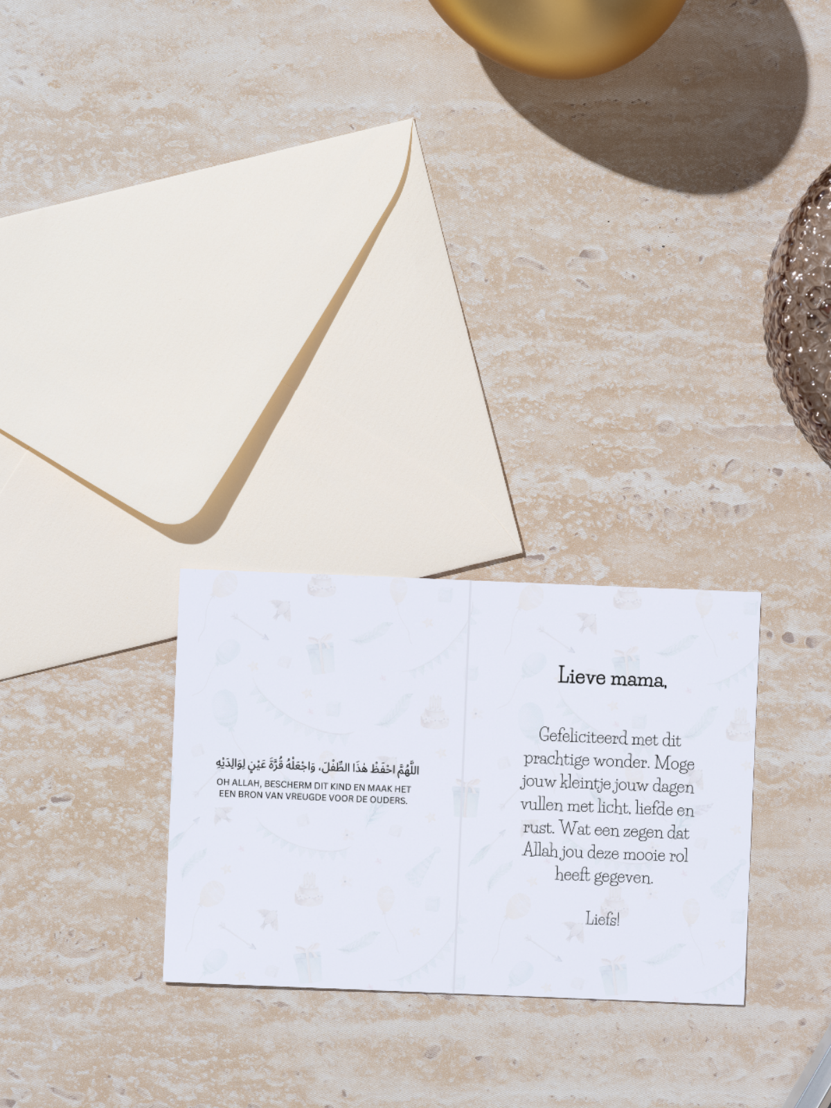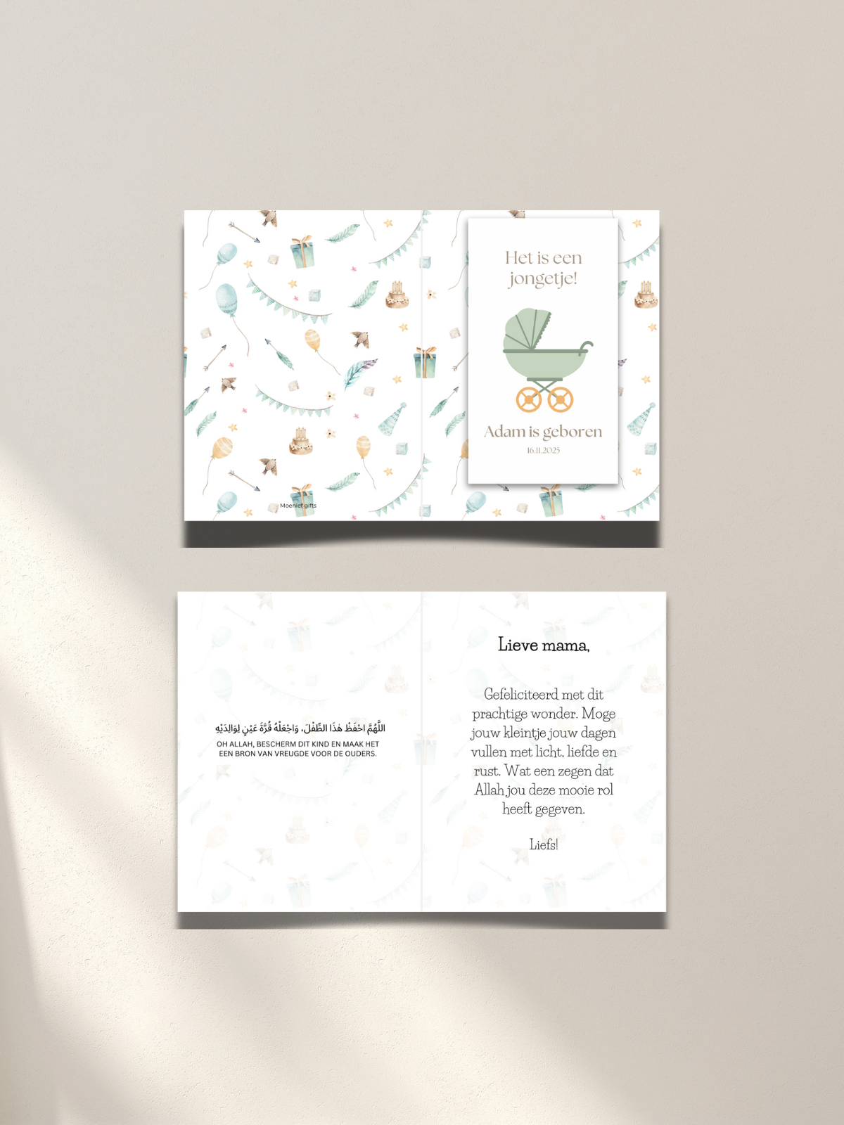 De naam en geboortedatum kunnen volledig gepersonaliseerd worden, zodat de kaart echt aansluit bij jouw moment. Een mooie, betekenisvolle manier om jouw geluk te delen en iemand te verrassen met een kaart vol warmte en barakah.