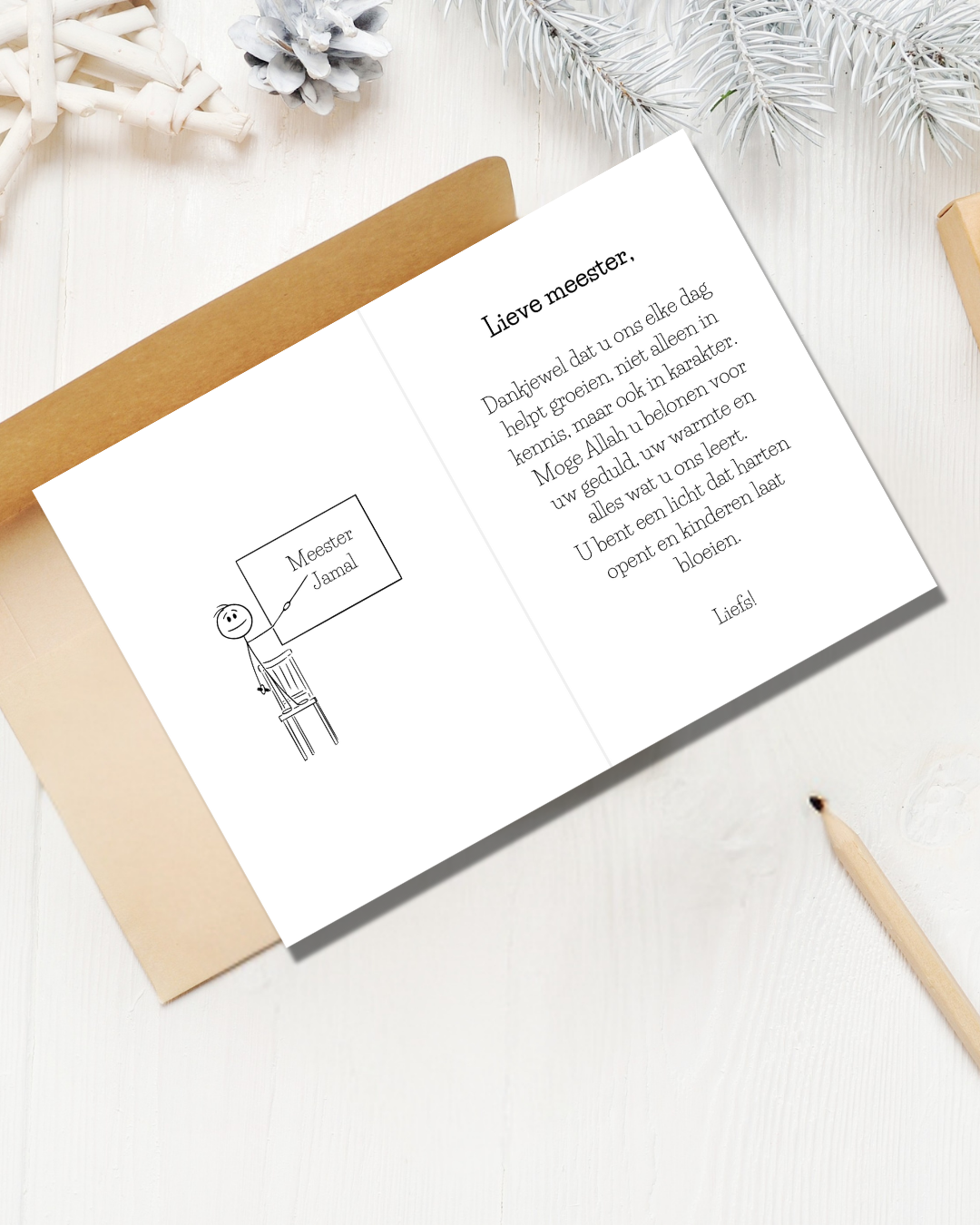 Ideaal voor het einde van het schooljaar, een bedankmoment of gewoon om waardering te laten blijken. De binnenkant bevat een korte boodschap die op verzoek aangepast kan worden, zodat de kaart helemaal persoonlijk wordt gemaakt.