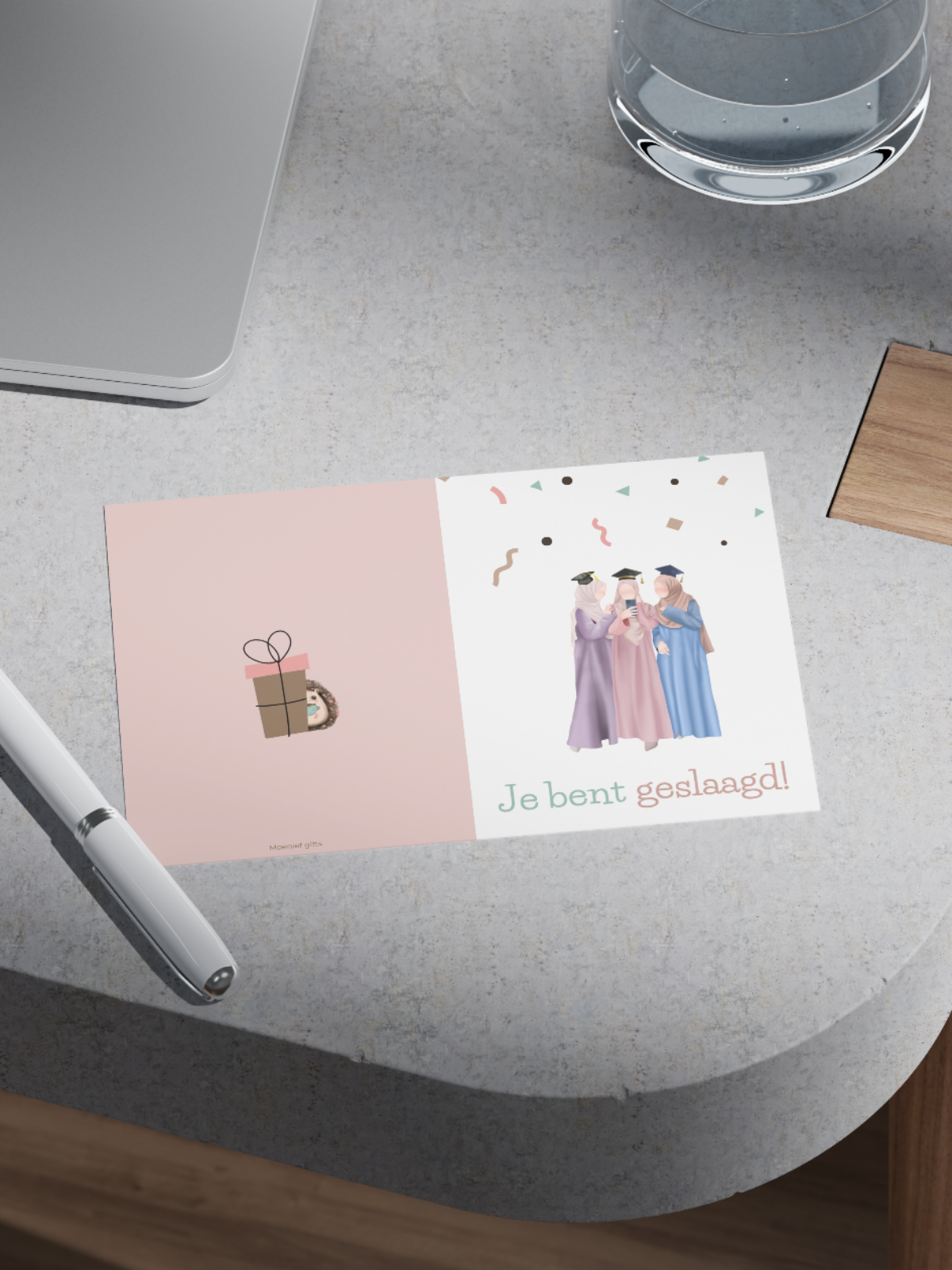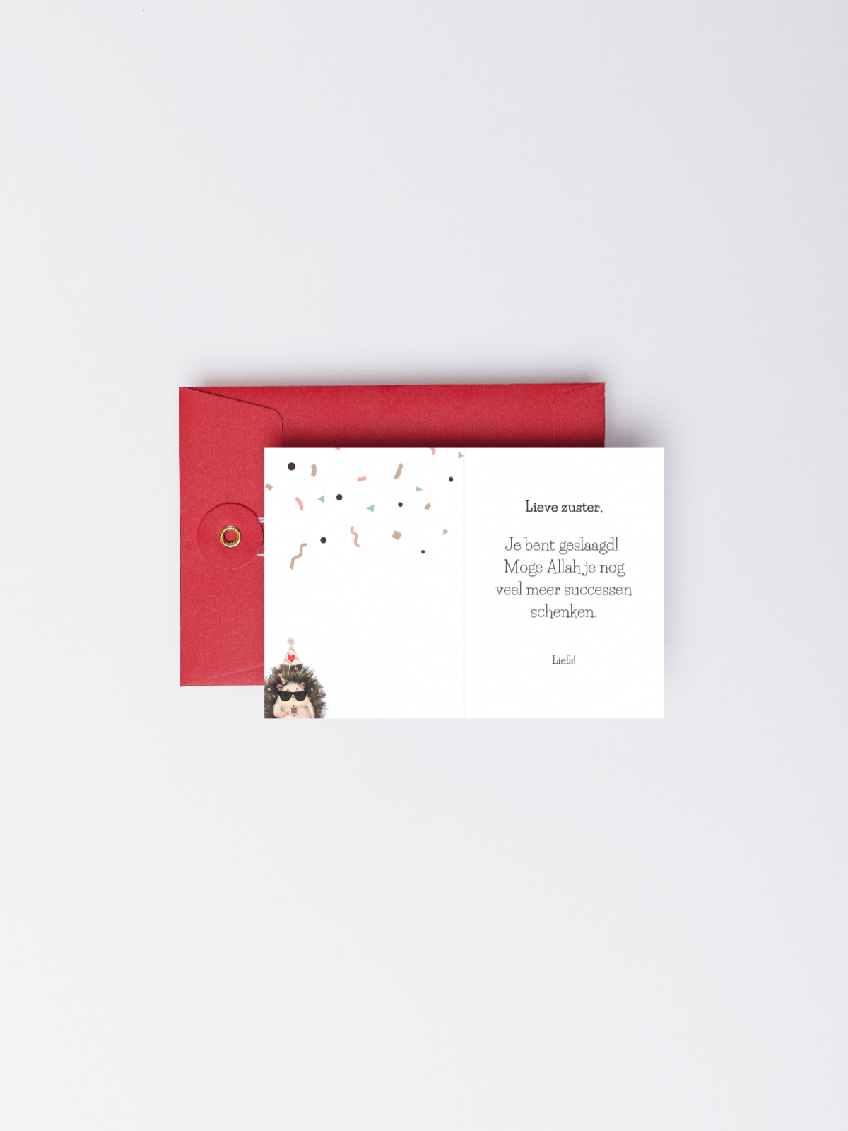Binnenin staat een mooie dua en een korte, liefdevolle boodschap om jouw waardering en trots te laten blijken. Een kaart die niet alleen feliciteert, maar ook een bemoedigende herinnering is aan groei, inzet en Allah’s zegeningen.