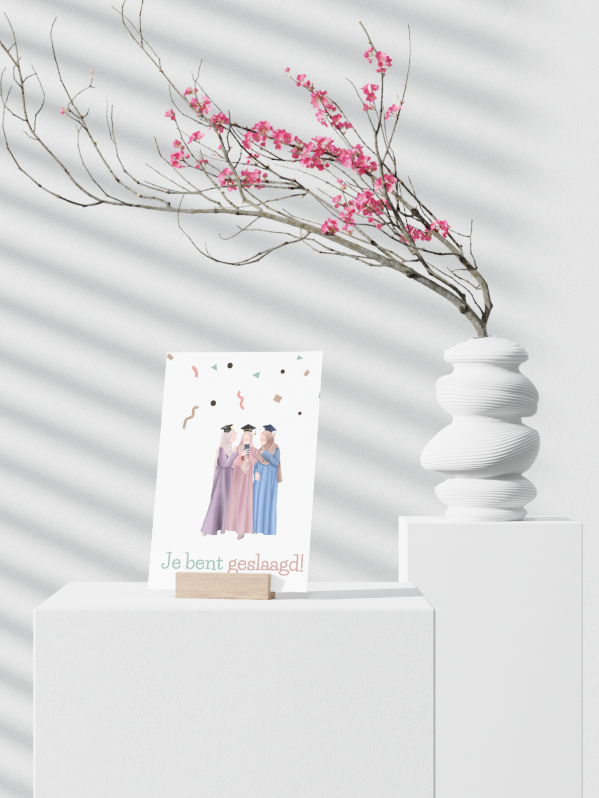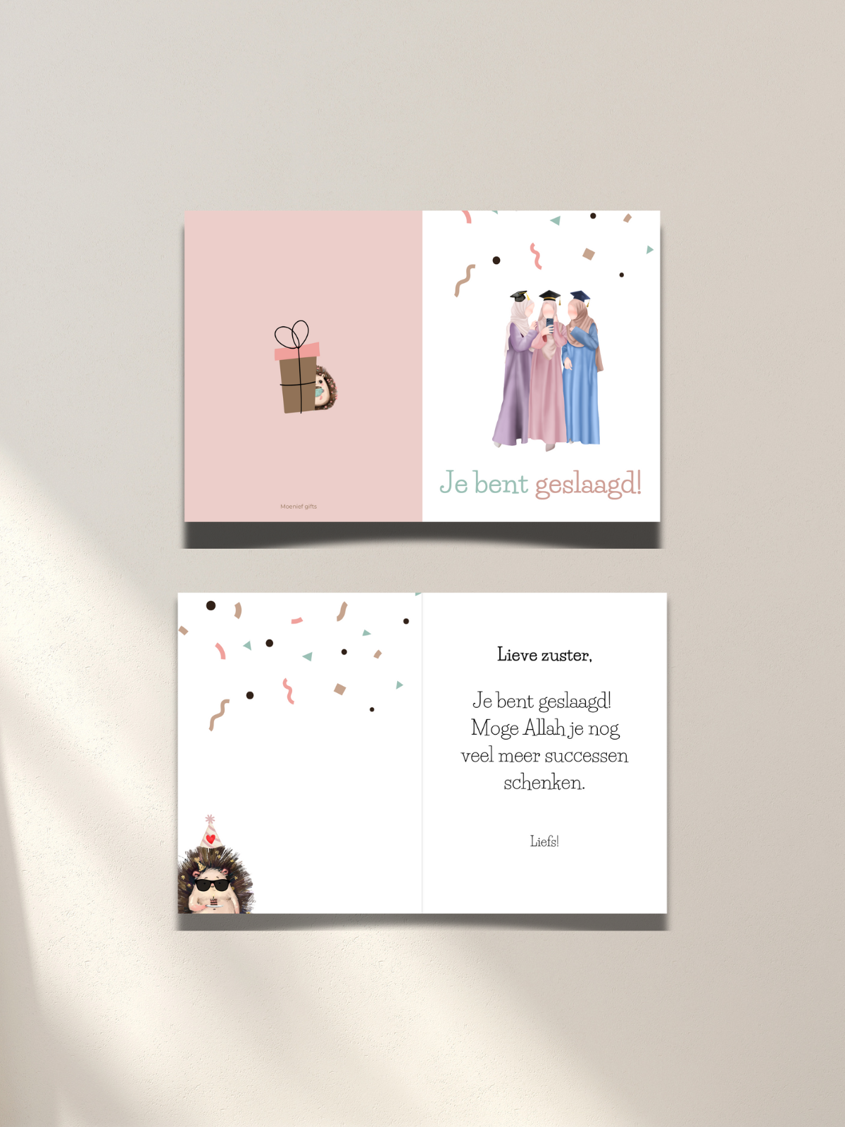 Deze kaart is speciaal ontworpen voor zusters die geslaagd zijn, een mijlpaal die zeker gevierd mag worden. De zachte kleuren, feestelijke details en de illustratie van trotse afgestudeerden geven de kaart een warme uitstraling.