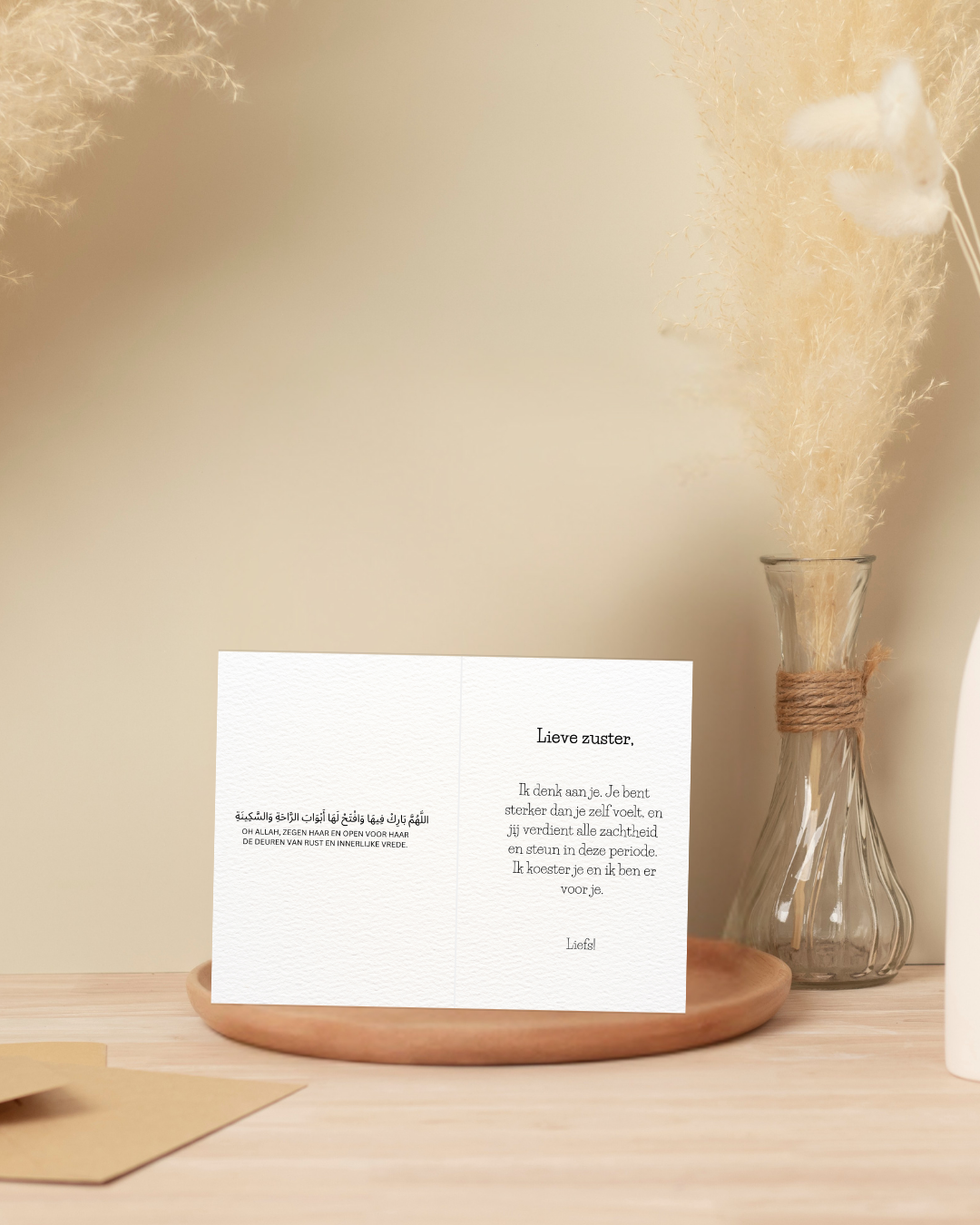 Een zacht en troostend kaartje speciaal voor zusters die wat extra liefde, rust of steun kunnen gebruiken. De voorzijde heeft een warme illustratie, en aan de binnenkant staat een mooie combinatie van een dua in het Arabisch én een liefdevolle persoonlijke boodschap. Dit maakt de kaart bijzonder geschikt voor momenten van verdriet, herstel, moeilijkheden of gewoon om iemand te laten voelen dat ze geliefd is.