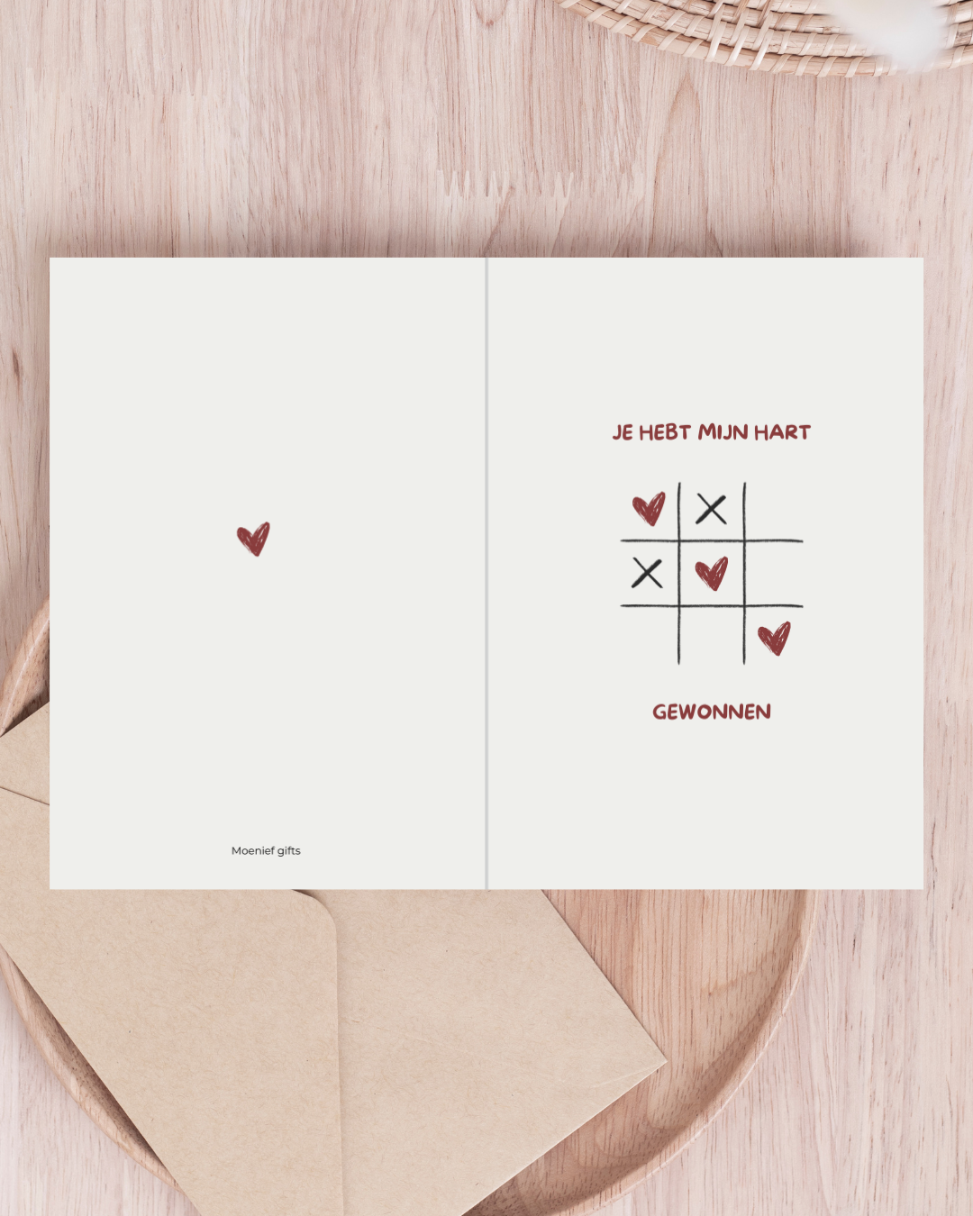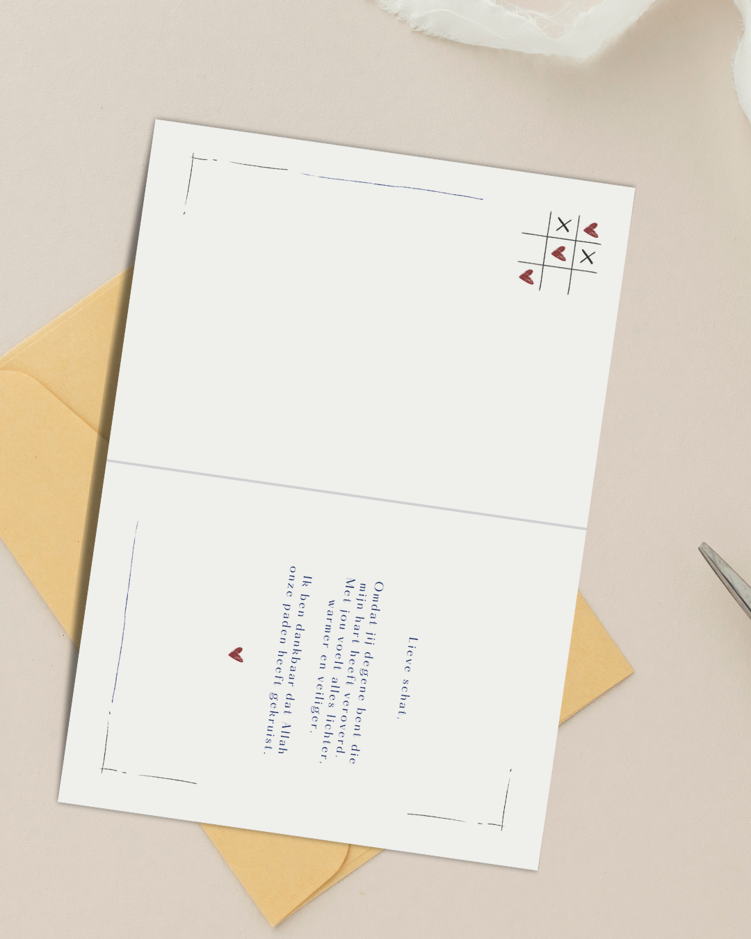 Een lieve en speelse kaart voor degene die jouw hart heeft veroverd. Het ontwerp met het kruisjestik-tok-spel en de handgetekende hartjes geeft de kaart een unieke, romantische uitstraling – luchtig, maar toch vol betekenis.