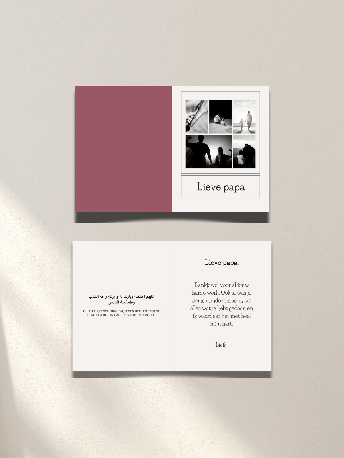 Een liefdevolle kaart om waardering uit te spreken richting papa. De kaart bevat een betekenisvolle islamitische dua in het Arabisch én Nederlands, samen met een persoonlijke boodschap aan de binnenkant.