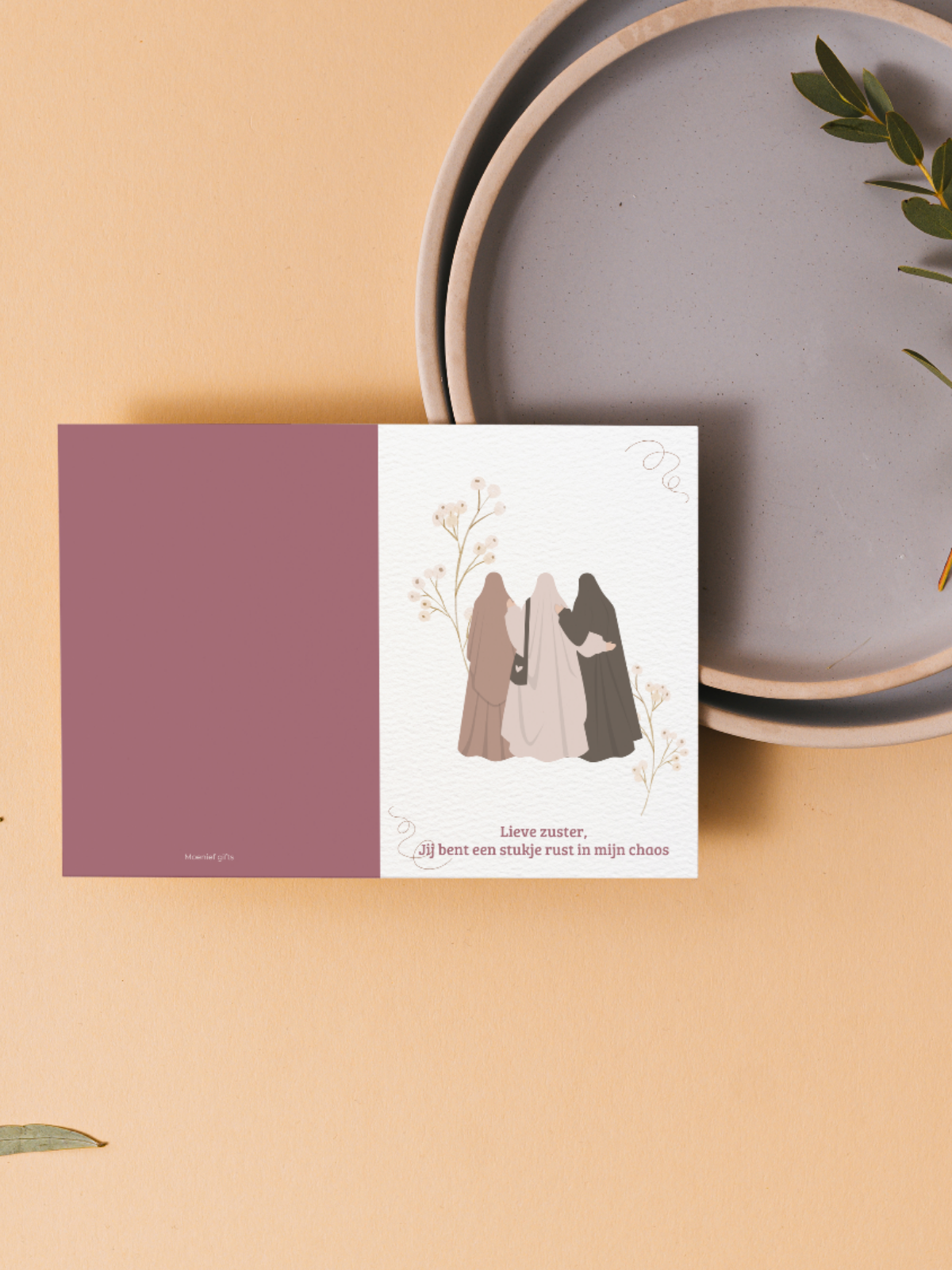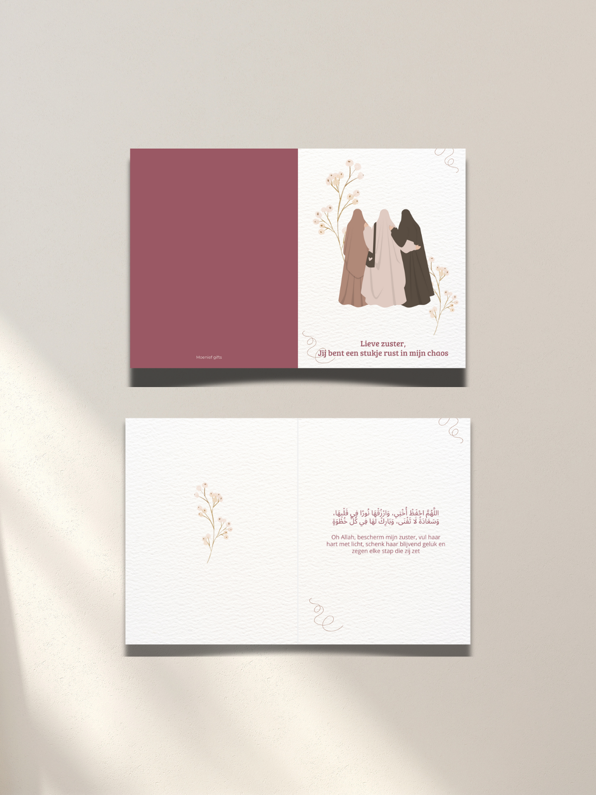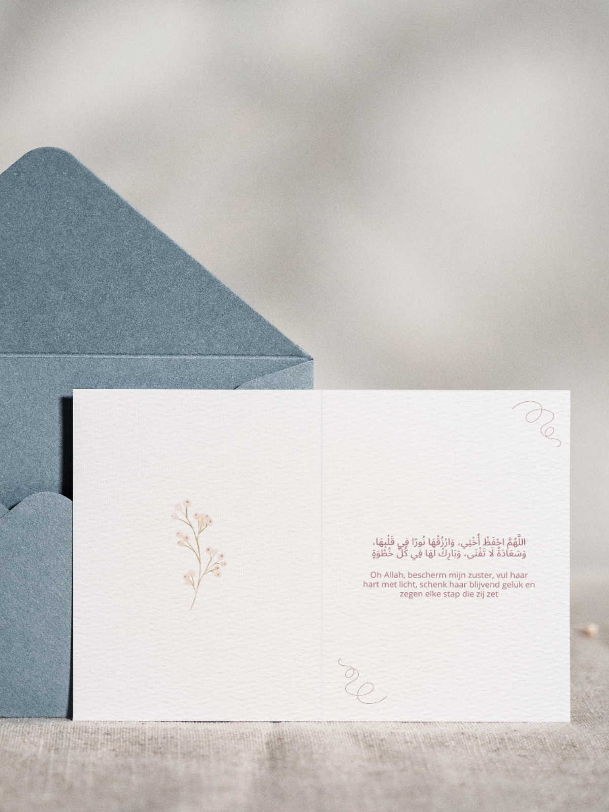 Een liefdevolle wenskaart voor jouw zuster, zacht, stijlvol en met een subtiele islamitische touch. De kaart bevat een mooie dua en een illustratie die de warmte van zusterliefde weerspiegelt. Perfect om te geven bij een speciaal moment, of gewoon om te laten weten hoeveel zij voor je betekent.