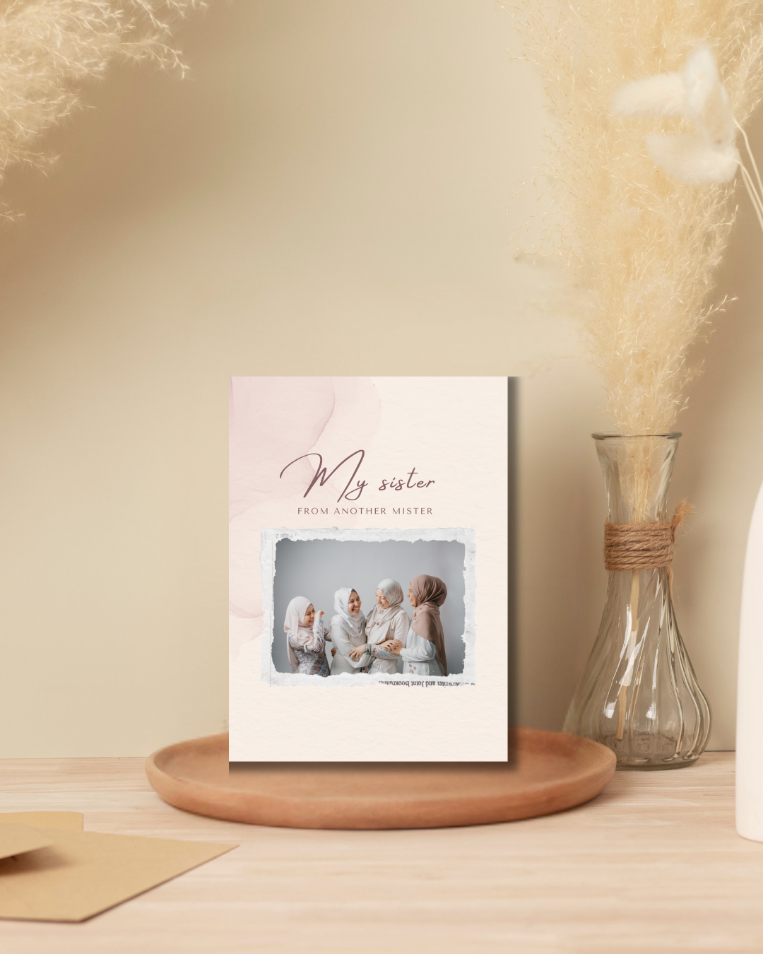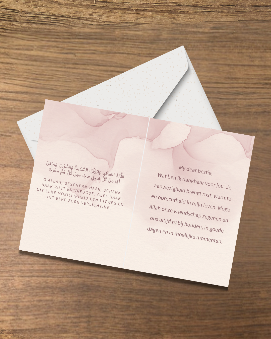 Aan de binnenkant staat een prachtige dua voor bescherming, rust en vreugde, naast een oprechte boodschap vol waardering. Een kaart die dankbaarheid, zusterliefde en verbinding in één ontwerp samenbrengt. Perfect om te geven aan je bestie, je zusters in geloof of die ene vriendin die altijd dicht bij je hart staat. Op verzoek kan de tekst of foto worden aangepast.