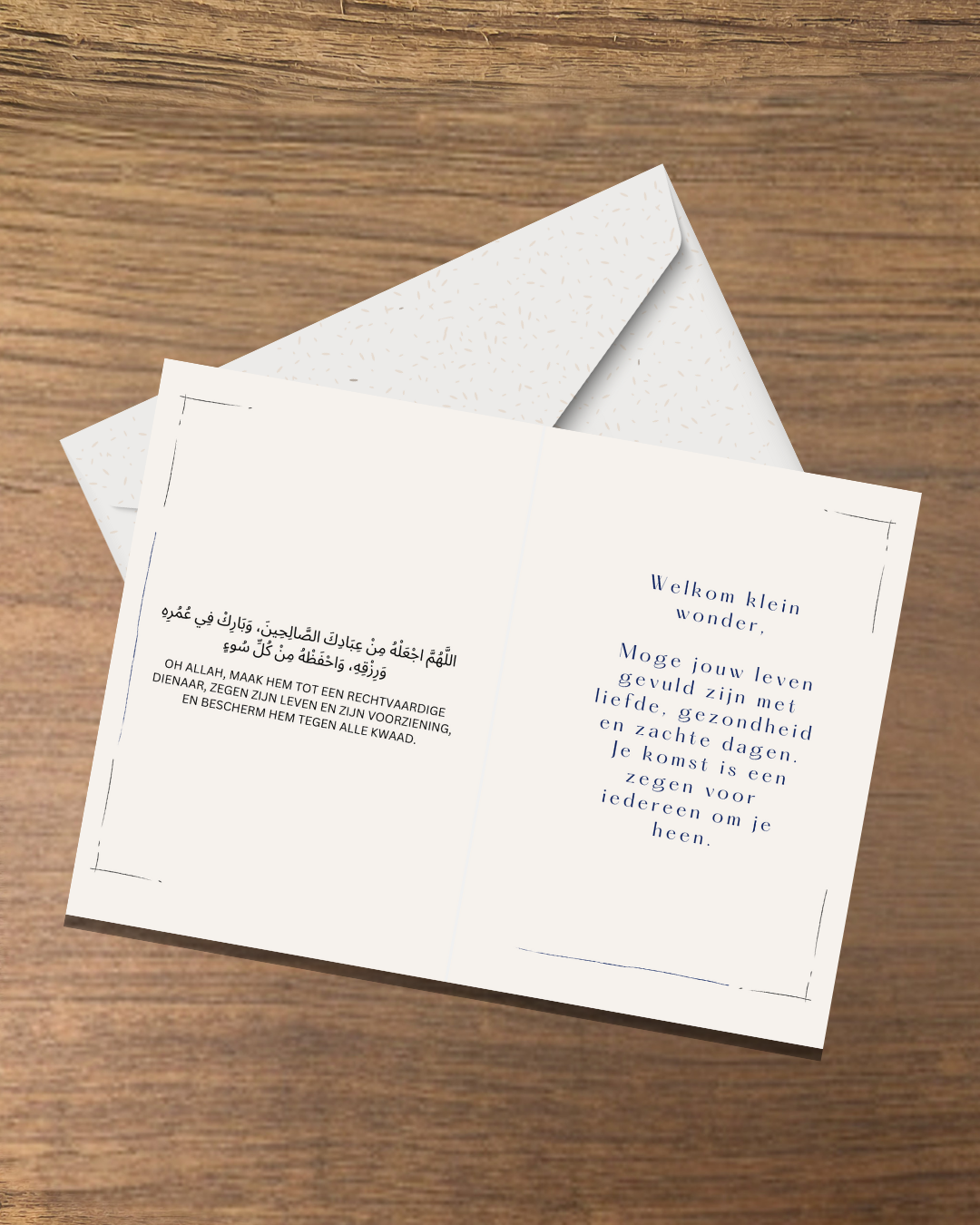Aan de binnenkant staat een prachtige dua voor bescherming, zegeningen en een gezegend leven voor het kindje, naast een liefdevolle tekst die zijn komst eert. Dit maakt de kaart niet alleen mooi om te geven, maar ook bijzonder waardevol om te bewaren.